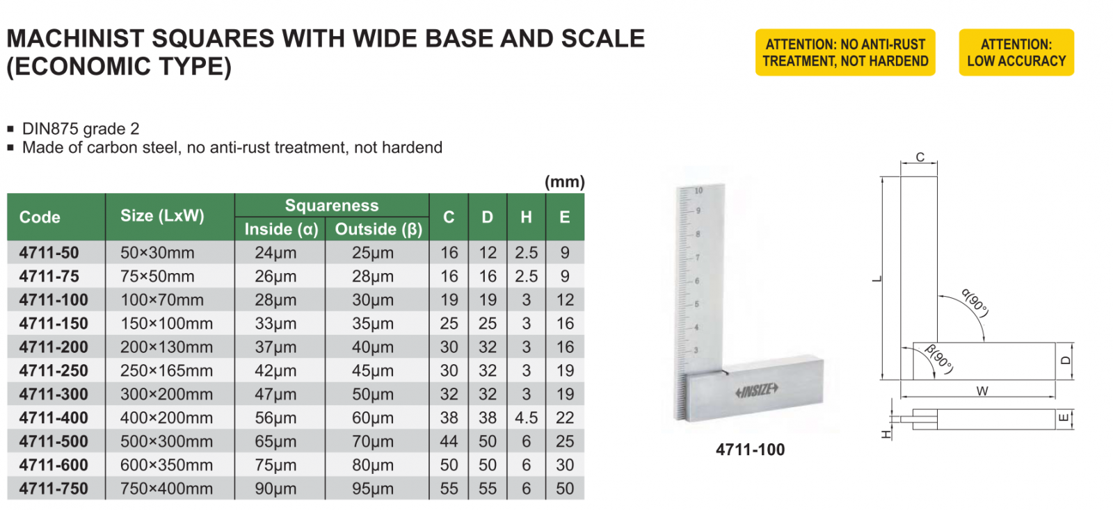 Thước đo góc INSIZE 4711-100 , MACHINIST SQUARES WITH WIDE BASE AND SCALE (ECONOMIC TYPE ) 4711-100