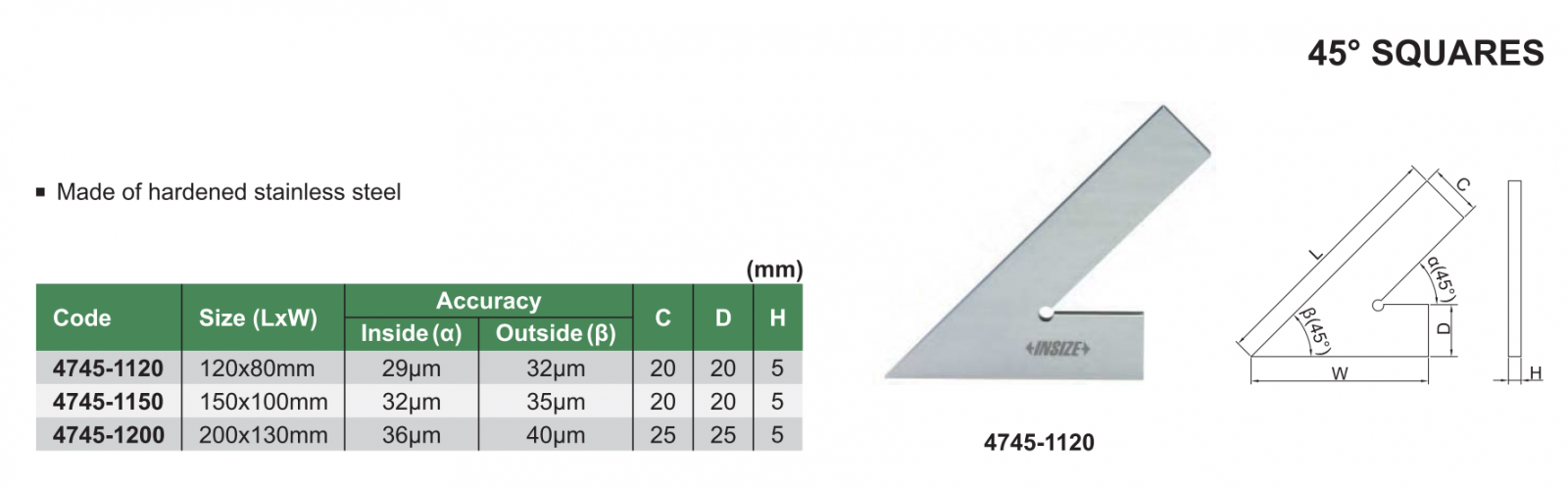 Thước đo góc INSIZE 4745-1120 , 45 độ SQUARE 4745-1120