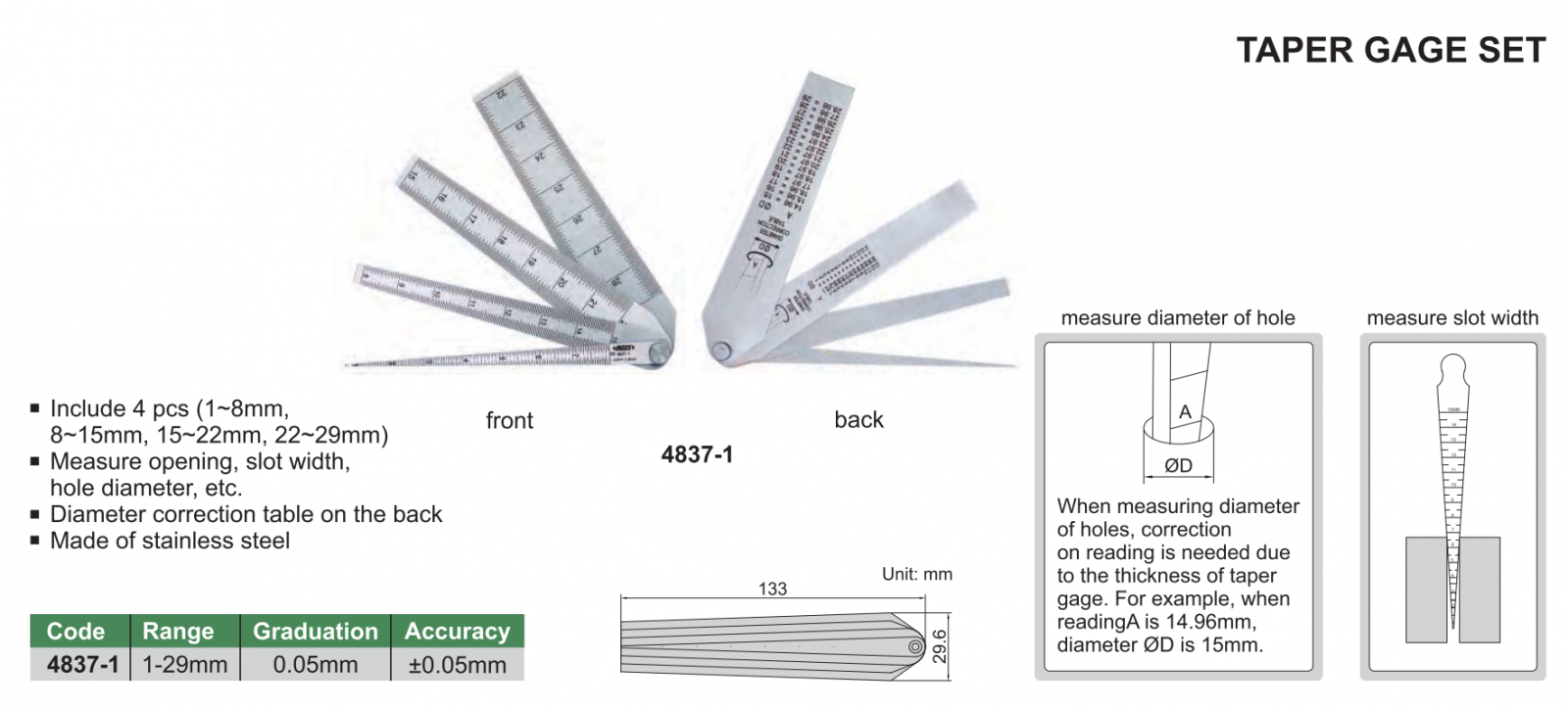 Thước đo rãnh INSIZE 4837-1 , TAPER GAGE SET 4837-1