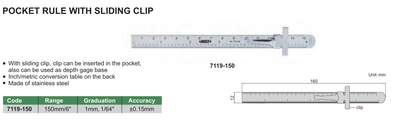 Thước lá INSIZE 7119-150 , POCKET RULE WITH SLIDING CLIP 7119-150