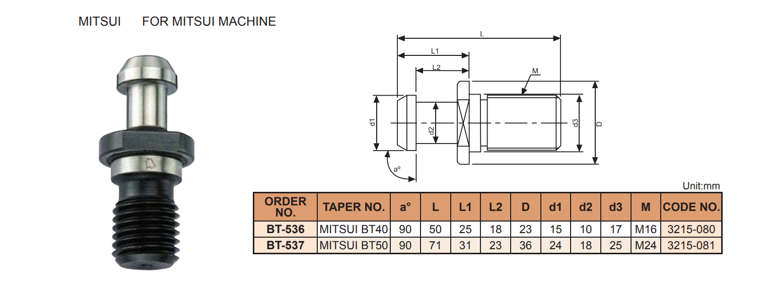 – Vít rút (đuôi chuột) cho bầu kẹp BT30, BT40, BT50: BT-510, BT-501, BT-502, BT-511, BT-503, BT-504, BT-512, BT-505, BT-506, BT-516, BT-517, BT-518, BT-519, BT-520, BT-521, BT-522, BT-523, BT-524, BT-525, BT-526, BT-527, BT-528, BT-529, BT-530, BT-531, BT-532, BT-533, BT-534, BT-535, BT-536, BT-537, BT-538, BT-539, BT-540, BT-541, BT-542, BT-543, BT-544, BT-545, BT-546, BT-547, BT-548, BT-556 của VERTEX dùng lắp với bầu kẹp kiểu BT30, BT40, BT50 để hít lên đài dao máy phay CNC.