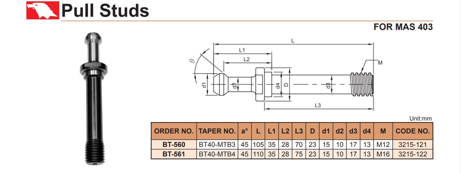 – Vít rút (đuôi chuột) cho bầu kẹp BT30, BT40, BT50: BT-510, BT-501, BT-502, BT-511, BT-503, BT-504, BT-512, BT-505, BT-506, BT-516, BT-517, BT-518, BT-519, BT-520, BT-521, BT-522, BT-523, BT-524, BT-525, BT-526, BT-527, BT-528, BT-529, BT-530, BT-531, BT-532, BT-533, BT-534, BT-535, BT-536, BT-537, BT-538, BT-539, BT-540, BT-541, BT-542, BT-543, BT-544, BT-545, BT-546, BT-547, BT-548, BT-556 của VERTEX dùng lắp với bầu kẹp kiểu BT30, BT40, BT50 để hít lên đài dao máy phay CNC.
