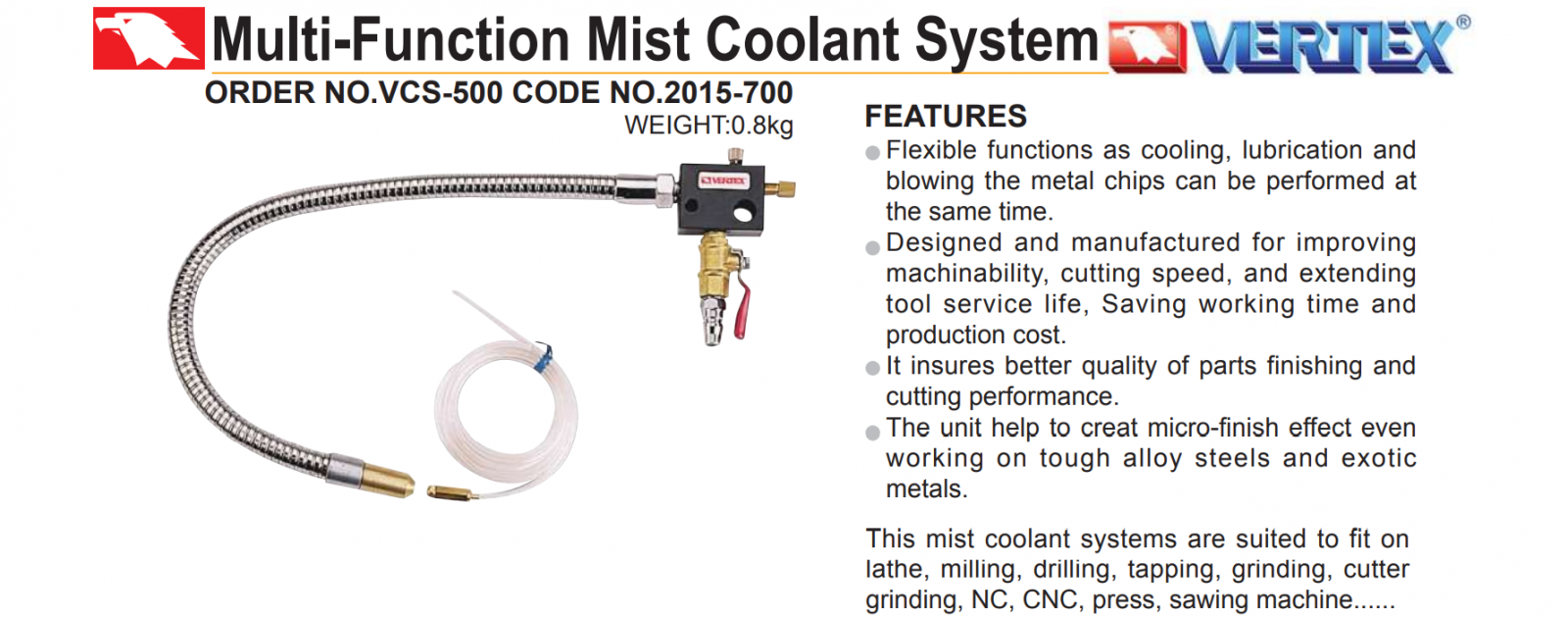 – Vòi tưới nguội dạng phun sương VCS-500, VMH-71 thích hợp sử dụng cho máy tiện, máy phay, máy khoan, máy ta rô, máy mài, mài cắt, máy NC, máy CNC, máy dậy, máy cưa,…